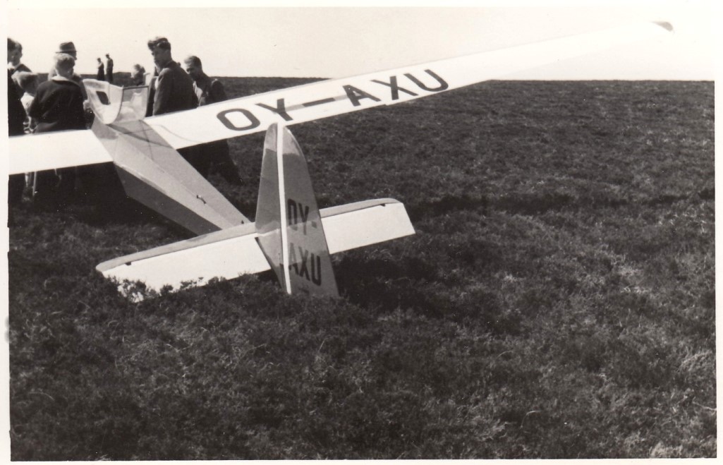 Flyet på billederne er OY-AXU, en Scheibe B-Spatz med byggenummer 524 fra 1953. Den havde øgenavnet