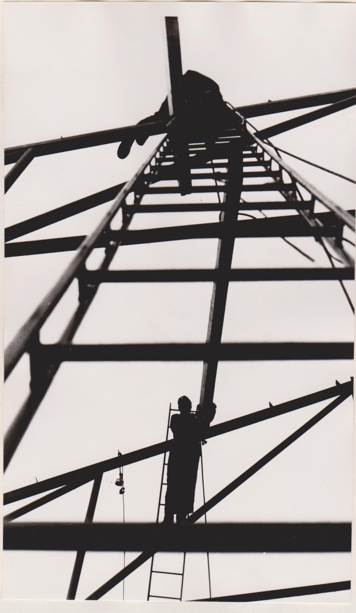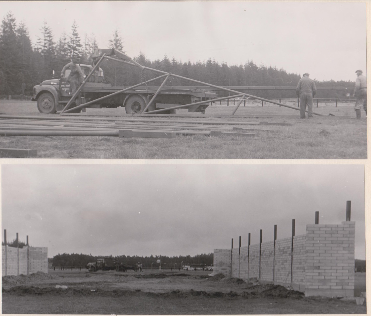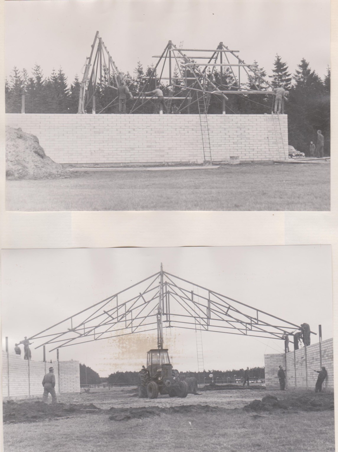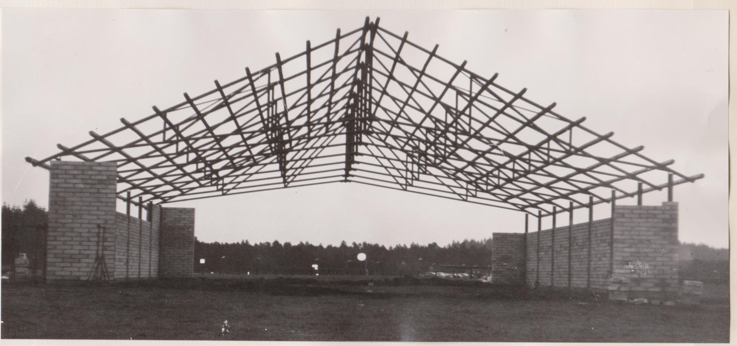Soklen blev støbt af et murerfirma og stålprofilerne, der skulle bære spærene, blev indstøbt i denne.