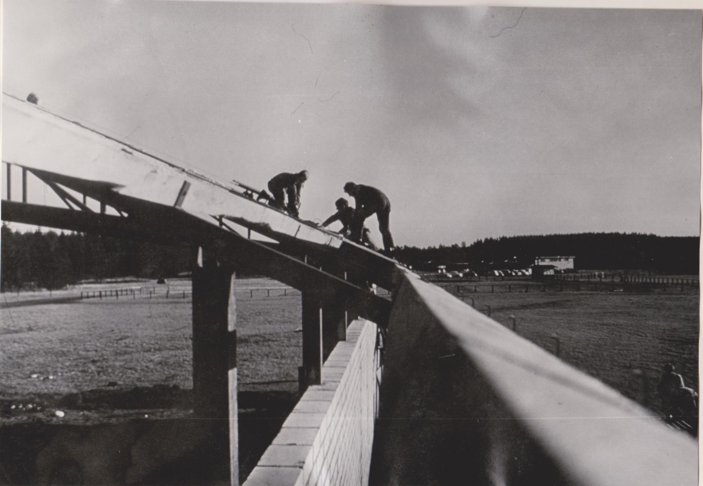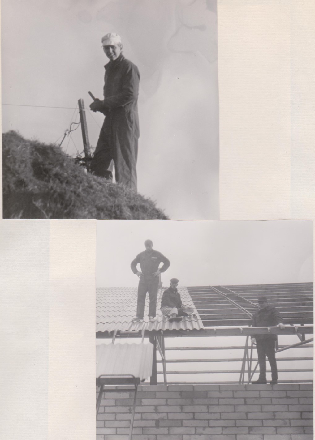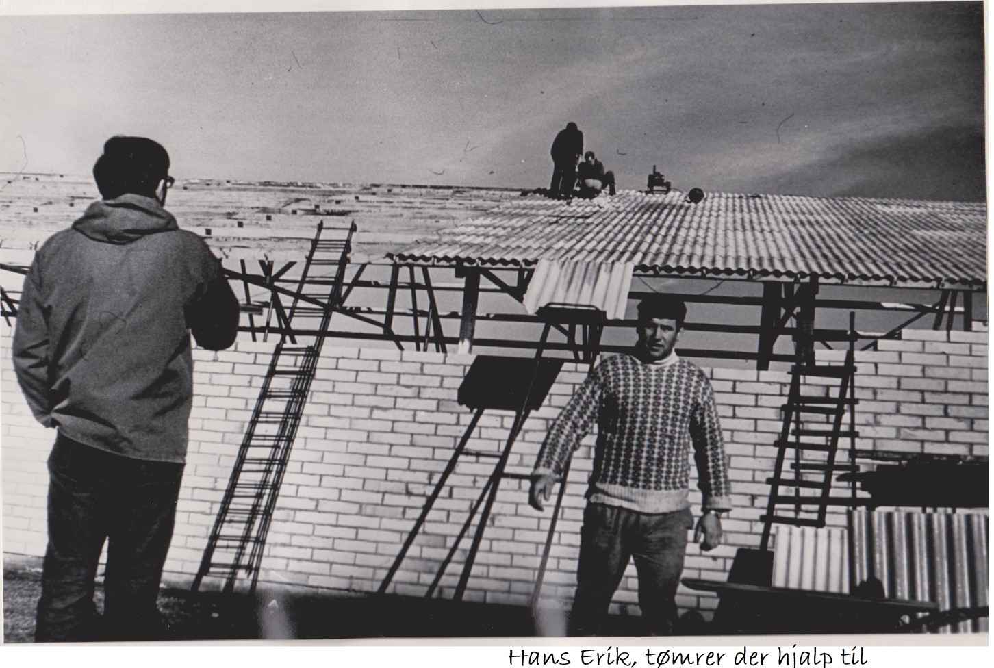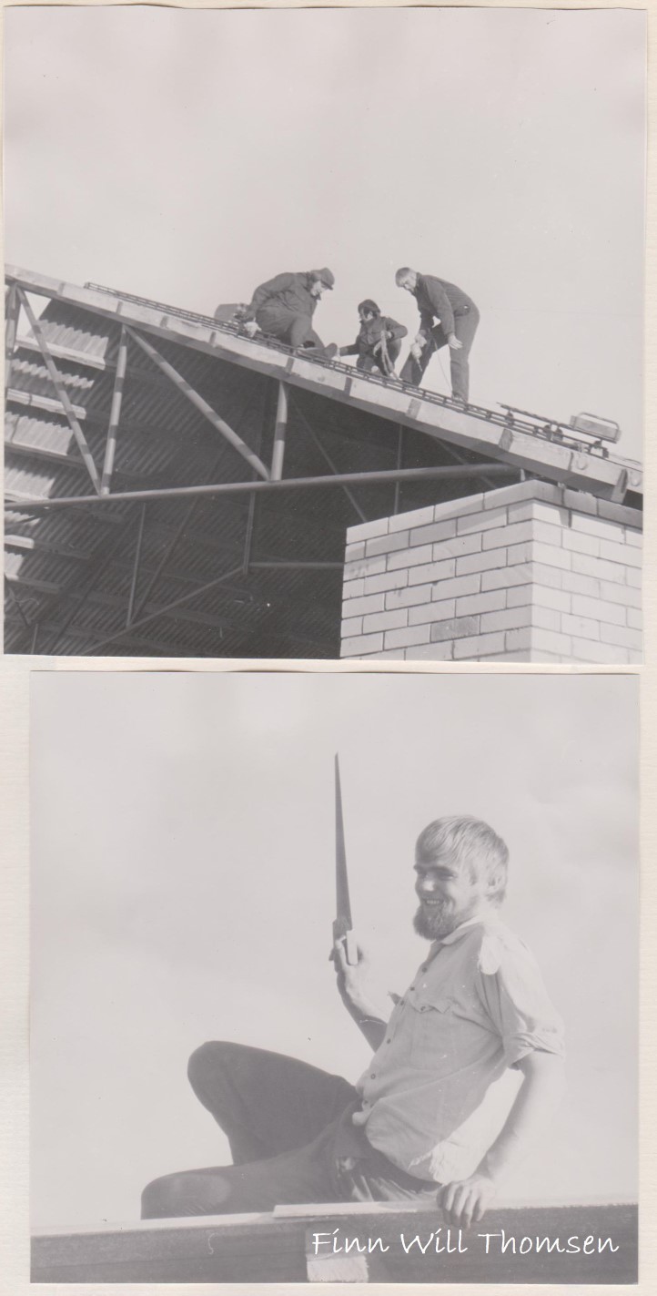 Alle spær og åse kom op og spændt fast. Så var det tid til at tænke på tagplader. Det er jo i nærheden af 600 stk. der skulle bruges. Også disse blev anskaffet som 2. sortering fra Eternitfabrikken. Der blev skåret hjørner af pladerne til den store guldmedalje. Vi var så heldige, at en tømrer, der kom en del på flyvepladsen, tilbød at låne os en tagpladetransportør – en lille vogn på nogle lette skinner, der kunne køre pladerne op. En meget stor hjælp.
